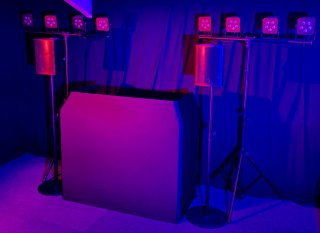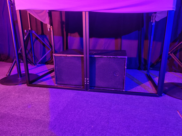 As always the audible size of the Music is much greater than the visual presence of the speakers as we hide a 1200w Void Acoustics bass speaker behind the booth fabric! This greats a fantastic sound whilst keeping the visual look nice and tidy.